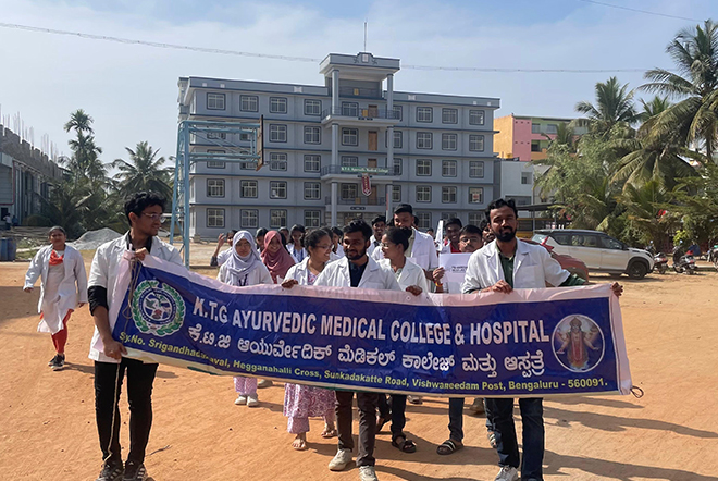In this regard, KTG Ayurvedic Medical College conducted Pledge taking session to support TB muktBharathAbhiyaan by all the teaching staff, students and interns on 28/01/2025. Also Rally was organized on 30/01/2025 near our college to raise awareness among the citizens about Tuberculosis.