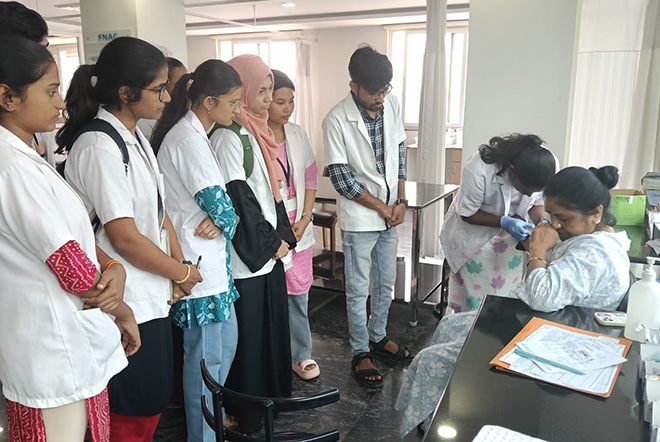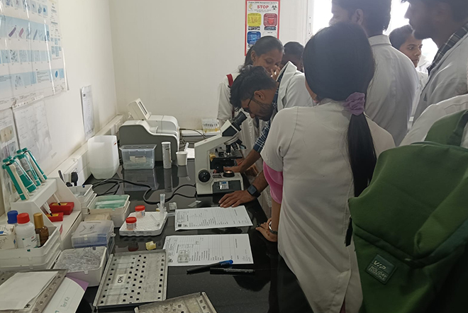 As part of the Roganidana syllabus, we visited the Kanva Pathology Lab at Nagarabhavi on 30/10/2024. The lab staff elaborately explained the process of collecting blood samples for various investigations. They demonstrated procedures such as stool examination, semen analysis, and urinalysis. Additionally, they showed abnormal cells and microorganisms present in the samples. The staff also explained the various automated machines used to carry out different investigations. Furthermore, they discussed imaging procedures like CT, MRI, X-ray, and USG. The staff displayed CT and MRI films and provided a detailed explanation of their indications and contraindications.